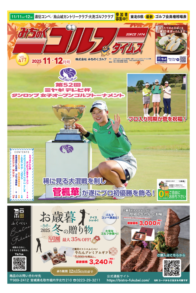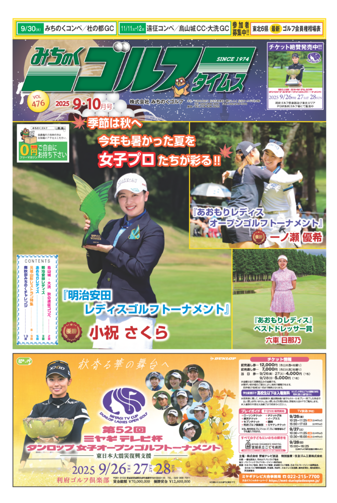 【みちのくゴルフタイムズ】バックナンバー ホーム【みちのくゴルフタイムズ】バックナンバー 【VOL.477】2025年11・12月号 ミヤギテレビ杯ダンロップ女子OP ダンロップフェニックスチャレンジinふくしま IASSシニア・プロアマ 冬季遠征におすすめ ゴルフ場特集 ※画像をクリックするとPDFファイルが表示されます。 【VOL.476】2025年9・10月号 明治安田レディス あおもりレディス 山形県ゴルフ場レストラン特集 南秋田チャレンジ ※画像をクリックするとPDFファイルが表示されます。 【VOL.475】2025年7・8月号 避暑・高地ゴルフ場特集 青森県ゴルフ場レストラン特集 岩手県ゴルフ場レストラン特集 宿泊・遠征ゴルフ場特集 ※画像をクリックするとPDFファイルが表示されます。 メニュー 電話する トップページ ゴルフ会員権情報 みちのくゴルフタイムズ ゴルフ会員権相場 ゴルフボランティア 運営会社情報 仙台本社 〒980-0811 仙台市青葉区一番町1-4-1 仙台ワールドビル2F TEL:022-266-3091 FAX:022-216-1070 秋田営業所 〒010-0062 秋田市牛島東7-19-49 TEL:018-836-7523 FAX:018-832-4850 E-Mail support@michinokugolf.co.jp